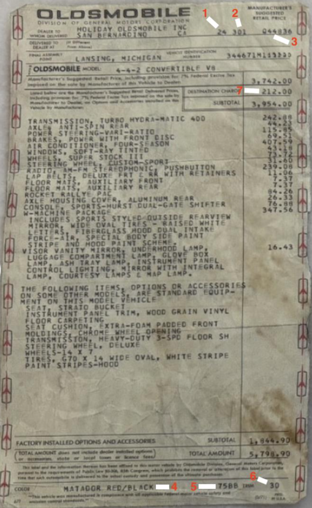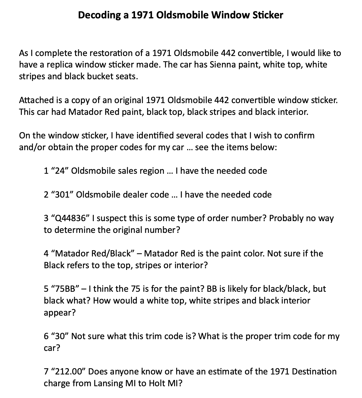 My first new car was a 1971 Oldsmobile SX convertible with Sienna paint, white top & black interior. I now have a 1971 442 convertible with the same tricolor. I would like to have a replica window sticker made. Attached is an illustrative 1971 window sticker that I am trying to decode ... see my questions attached. Any help would be appreciated ... Thanks Greg